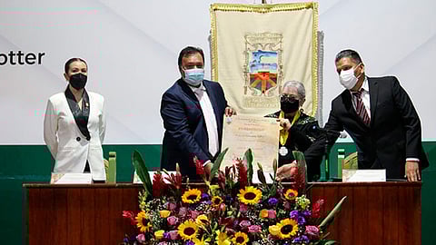 Fue el presiente Arreola Vázquez quien, acompañado por la síndico Claudia Berenice Reyes Ferráez y el secretario del Ayuntamiento, Ádemir González Reyes, además del cuerpo de Regidores y funcionarios municipales, hizo entrega de la condecoración.