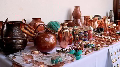 En la casa de la cultura se instaló la exhibición y venta de alfarería, rebosos, cobre, bordados, muñecas, textiles y otros artículos hechos por artesanos de diferentes municipios del estado de Michoacán.