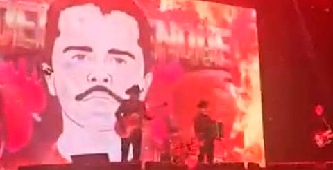 Durante su actuación, la agrupación interpretó el corrido El dueño del Palenque mientras en las pantallas del escenario se proyectaban imágenes del presunto narcotraficante.