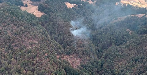 La Comisión Forestal de Michoacán (Cofom) informó que, de acuerdo con el Centro Estatal de Manejo del Fuego, la aeronave realizó cinco descargas de mil 200 litros de agua.