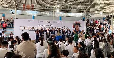 Morelia, Michoacán (MiMorelia.com).- Esta mañana se presentó oficialmente el Himno de Michoacán a estudiantes, docentes y destacadas personalidades del ámbito estatal, esto, en la Secundaria Federal No. 11 Simón Bolívar de la capital michoacana, para que a su vez, a partir de hoy comience a entornarse en todas las instituciones educativas públicas de la entidad.