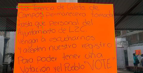 “La tenencia de Caleta de Campos permanecerá tomada hasta que el personal del Ayuntamiento de LZC venga a escucharnos y acepte nuestro registro para poder tener una votación”, refiere una de las pancartas que pobladores colocaron en el inmueble.