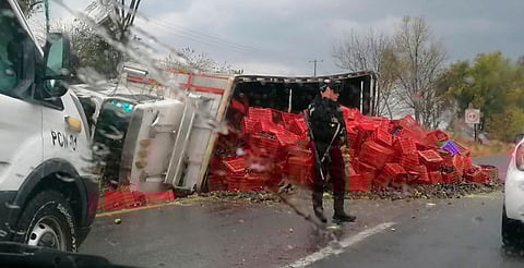 Esta tarde de domingo se registró una volcadura de camión de carga que trasladaba aguacate, mismo que se regó sobre la carpeta asfáltica de la carretera Morelia- Pátzcuaro.