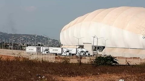 En las instantáneas se muestra al menos cinco de estos camiones a las afueras del estadio de Mazatlán, mismo que aún se encuentra en construcción.