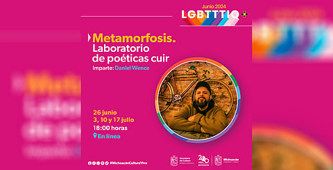 Morelia, Michoacán (MiMorelia.com).- Si te gusta escribir poesía, la Secretaría de Cultura de Michoacán (Secum) te invita a participar en “Metamorfosis. Laboratorio de poéticas cuir”. Este evento se llevará a cabo en línea los días 26 de junio y 3, 10 y 17 de julio, a las 18:00 horas, en el marco del mes del orgullo LGBTTTIQ+.
