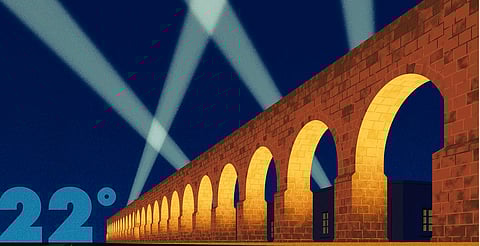 "Yendo por la acera del Bosque Cuauhtémoc, podemos ver este juego de luces por encima del imponente Acueducto, una de las edificaciones más emblemáticas de la bella ciudad de Morelia. Los reflectores nos indican que allá, no muy lejos, en el corazón de la urbe, algo extraordinario está ocurriendo. Una gran celebración: el Festival Internacional de Cine de Morelia", explicó el artista visual sobre la identidad gráfica que definirá este año el FICM.