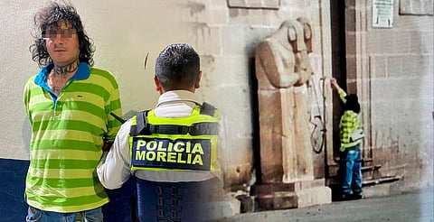 Morelia, Michoacán (MiMorelia.com).- Elementos de la Policía Turística de Morelia detuvieron a un individuo que fue sorprendido en flagrancia cuando presuntamente realizaba un grafiti en uno de los muros de la Catedral, justo a un costado de la plaza Benito Juárez, en pleno Centro Histórico.
