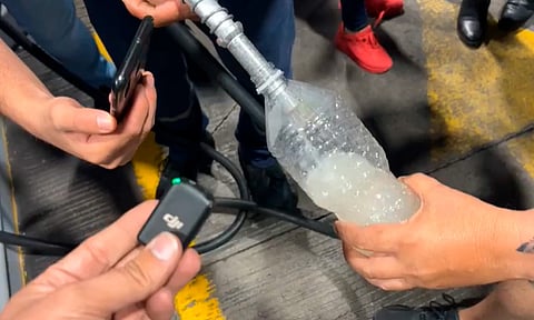 En el sitio, al menos una decena de los afectados hizo la muestra al cargar "gasolina" en una botella de plástico y confirmaron, ante las cámaras de Sanción Social, que salía "más agua que gasolina".