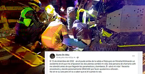 "El 13 de diciembre del 2022 en el puente arriba de la salida a Pátzcuaro en Morelia, Michoacán un accidente en él que me amputaron las dos piernas cambió mi vida. Esta persona de chamarra café me atendió antes de que llegarán los paramédicos y bomberos, Él salvó mi vida! Necesito encontrarlo y decirle personalmente GRACIAS! por favor ayúdenme a difundir. No sé ve su cara pero él va a saber que es él cuando lo vea."