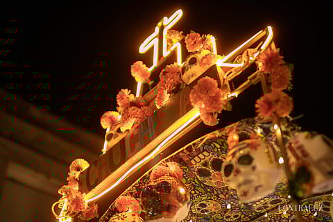Con luces, flores, las fotos de sus seres queridos, calaveras, una catrina gigante y hasta comida y alcohol, es que este “bocho” llama la atención de todos al circular por la ciudad.