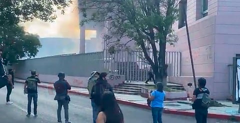 Fue entonces que los manifestantes lograron romper una de las ventanas del Palacio de Justicia, dónde lanzaron un petardo al interior del edificio.