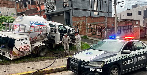 Reportes refieren que en la avenida La Joya se encontraba un pipa de gas suministrando combustible a una casa, cuando en determinado momento fallaron los frenos y comenzó a moverse sin control sobre la calle.