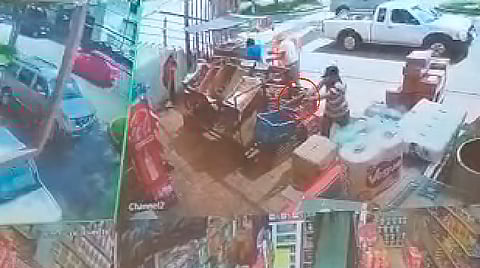 En las imágenes se observa que un joven ingresa al negocio, pero otro sujeto entra corriendo al lugar y se dirige al muchacho, posteriormente lo amenaza con un arma de fuego y la víctima se cubre el rostro con sus manos.