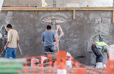 Morelia, Michoacán (MiMorelia.com).- El artesano Alejandro Jacobo, originario de la tenencia de Capula, trabaja en la elaboración de un mural permanente en el Paso Catrinas, ubicado a la altura de Villas del Pedregal, al poniente de Morelia.