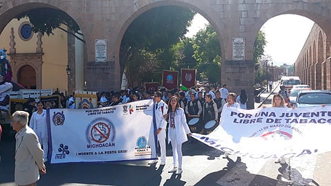 Morelia, Michoacán (MiMorelia.com/Redacción).- Este miércoles por la mañana se realizó una marcha en la ciudad para conmemorar el Día Michoacano sin Fumar.