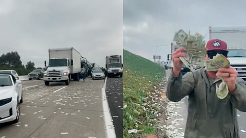 Estados Unidos (MiMorelia.com).- En una carretera de California, Estados Unidos, ocurrió un hecho insólito cuando miles de dólares aparecieron tirados sobre el asfalto, lo que provocó que las personas detuvieran sus vehículos para recoger el dinero.