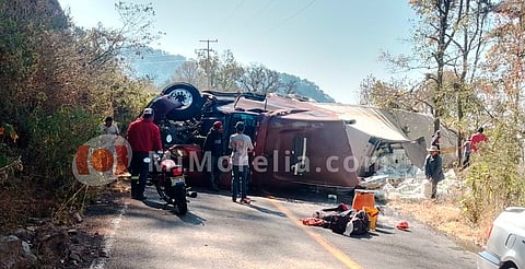 Charo, Michoacán (MiMorelia.com).-El conductor un tráiler que trasladaba un cargamento de harina Maseca, perdió el control de su unidad y volcó quedando atravesado sobre la carretera Morelia-Mil Cumbres.