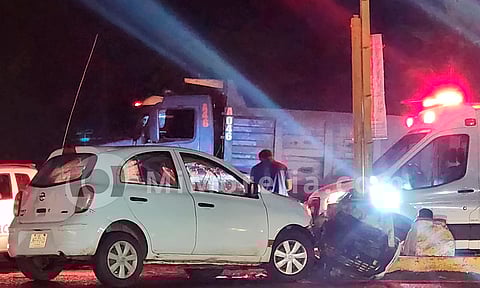 El fuerte choque se reportó la madrugada de este viernes en las inmediaciones del entronque de “Las Adelitas”, donde el chofer de un Nissan March de color blanco, al parecer se quedó dormido y terminó por impactar contra la base de dicho semáforo.