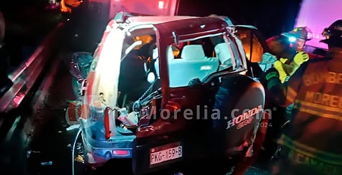 El trágico percance sucedió durante la noche de este lunes aproximadamente en el kilómetro 25 de la citada vialidad, dentro del territorio de Copándaro de Galeana, donde una camioneta Honda CRV de color negro, terminó parcialmente aplastada entre la banda metálica de contención y un tractocamión blanco que la embistió.