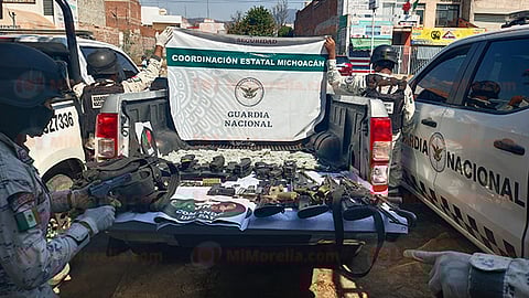 Por lo anterior los Guardias Nacionales les dieron alcance a los muchachos quienes en su intento de huida tiraron 3 pistolas, logrando requerirlos, mientras que al revisar el automotor fueron aseguradas 4 armas largas, 944 cartuchos útiles, 36 cargadores, 105 envoltorios con droga, diverso equipo táctico y calcomanías con imán del citado grupo delictivo.