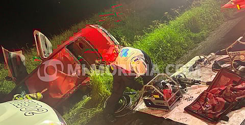 El vehículo siniestrado quedó volcado fuera de la cinta asfáltica. Las labores de rescate se extendieron durante varias horas, apoyadas por equipos especializados como herramientas hidráulicas de corte y expansión.