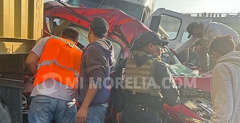 Ziracuaretiro, Michoacán (MiMorelia.com).- La mañana de este jueves se registró un choque múltiple, en el que un auto particular terminó aplastado entre dos camiones de carga, con saldo preliminar de varias personas heridas, en la autopista Siglo XXI. A unos kilómetros otro vehículo volcó.