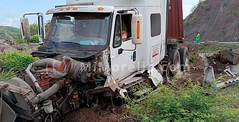 Posteriormente cerca de las 08:30 horas, pero en el kilómetro 205, un tractocamión Internacional con matrícula; 64-BD-7B, choco contra la barrera de contención y se salió del camino para terminar dentro de un predio con la cabina despedazada.