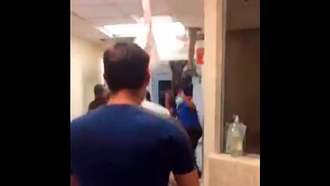 En redes sociales circula un video en donde se observa a enfermeros y personal de seguridad intentando contener al hombre, quien recorre el ducto pero en un momento dado su peso gana y por poco cae al suelo.
