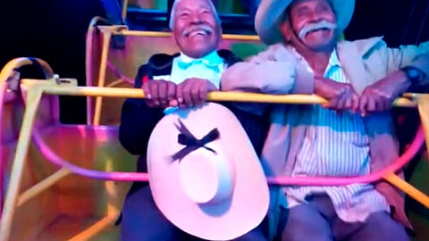En redes sociales circula una grabación en donde se observa a dos señores de la tercera edad que están en la atracción conocida como "dragón", ambos sonríen divertidos.