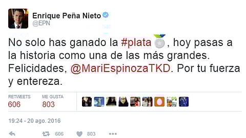 "No solo has ganado la #plata, hoy pasas a la historia como una de las más grandes. Felicidades, @MariEspinozaTKD. Por tu fuerza y entereza", publicó el mandatario nacional a través de su cuenta en Twitter.