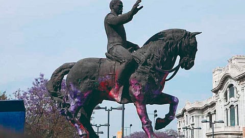 En su paso por Bellas Artes, mujeres encapuchadas pintaron con aerosol morado el monumento de Francisco I. Madero, colocado el 20 de noviembre de 2010 como aniversario del Centenario de la Revolución.