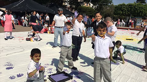 La pinta del telón "La paz está en ti" forma parte de la campaña "Niños y niñas sembradores de paz", que emprende el SESESP.
