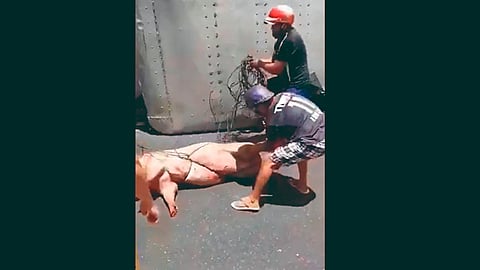En un video que circula en redes sociales, se ve cómo los pobladores sacan algunos animales del tráiler volcado, mientras que otros atan a los cerdos y los arrastran.