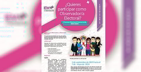 Morelia, Michoacán (MiMorelia.com).- El 7 de mayo, es el último día para que las personas que deseen participar como Observadora u Observador Electoral el próximo 2 de junio puedan registrarse y dar seguimiento a las actividades de la elección de Diputaciones Locales y Ayuntamientos.