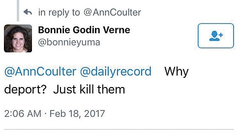 Bonnie Godin Verne, maestra de la escuela judía Pardes en Scottsdale, escribió una serie de mensajes en su cuenta personal de Twitter en donde insultó a indocumentado y a musulmanes e incluso pidió que se les matara con un balazo en la cabeza.