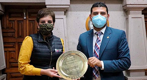 Morelia, Michoacán (MiMorelia.com).- El presidente del Congreso del Estado, Octavio Ocampo Córdova hizo entrega de un reconocimiento a la titular de la Secretaría de Salud en Michoacán, Diana Carpio Ríos y al personal del sector salud por su ardua labor, compromiso y profesionalismo frente al Covid-19.
