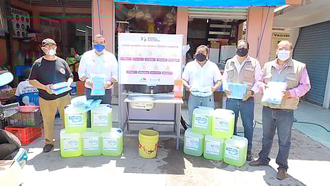 En ambos mercados, Barragán Vélez entregó 10 mil cubrebocas y 400 litros de líquido desinfectante, que serán distribuidos entre los comerciantes y los usuarios de los espacios comerciantes.