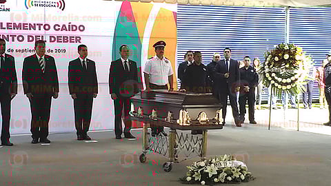 Morelia, Michoacán (MiMorelia/RED 113).- Este viernes el secretario de Seguridad Pública, Israel Patrón Reyes, encabezó un homenaje luctuoso para el policía caído en cumplimiento de su deber, Ediel Ríos Villaseñor, mismo que pereció el jueves pasado en una balacera contra gatilleros en la colonia Balcones del Quinceo que está en las cercanías del Estadio Morelos en esta capital, hecho en el que también pereció uno de los presuntos sicarios.