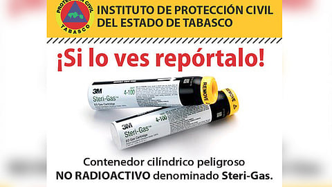 Jorge Adalberto Méndez Landero, director Operativo de Protección Civil, dijo que fueron informados de la pérdida de un contenedor y añadió "no es material radiactivo, es un material que se llama Steri-Gas, viene en un cilindro negro con amarillo, el cual de ser manipulado puede generar problemas severos en la salud", dijo.