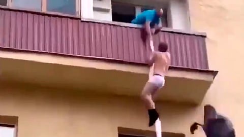 En la grabación se puede ver el momento exacto en que el amante desciende del edificio, usando solo calzoncillos blancos y calcetines, con la ayuda de unas sábanas atadas a manera de cuerda, mientras el marido de la mujer, furioso por la escena, lo intenta atrapar y evitar que huya.