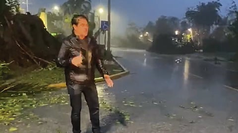 En la misma secuencia, ambos aparecen totalmente empapados debido a las intensas lluvias que generó el fenómeno meteorológico. Además, el presentador de hechos lucha por hablar y hacerse escuchar en medio de la tormenta.
