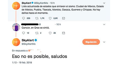 Al momento de publicar la lista de los lugares en donde se sintió, que fue en Ciudad de México, Estado de México, Puebla, Tlaxcala, Morelos, Oaxaca, Guerrero y Chiapas, un usuario respondió al tuit diciendo que se sintió en Cancún, Quintana Roo.