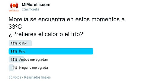 La encuesta realizada el pasado 5 de abril en la cuenta de Twitter de MiMorelia.com, en la cual se preguntó a los usuarios: "Morelia se encuentra en estos momentos a 33ºC ¿prefieres el frío o el calor?" ganó con un 66% la opción "frío", solo un 18% prefiere el calor, un 12% le agradan ambos, y un 4% respondieron con la opción "ninguno me agrada". Es importante tomar las medidas preventivas en esta primavera, cuidar tu piel, así como la salud de los niños, adultos mayores, personas con necesidades especiales y mascotas.
