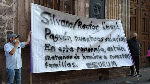 A las 9:00 de la mañana, los sindicalizados llegaron al primer cuadro de Morelia para volver a manifestar su molestia debido a que el rector de la Casa de Hidalgo, Raúl Cárdenas Navarro no ha depositado más de 130 millones de pesos correspondientes a salarios, aguinaldo, canasta navideña y prestaciones contractuales de este 2020.