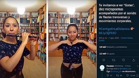 "Te invitamos a ver 'Gotas', diez microopoema acompañados por el sonido de flautas transversas y movimientos corporales", escribió el community manager de la Secretaría de Cultura MX.