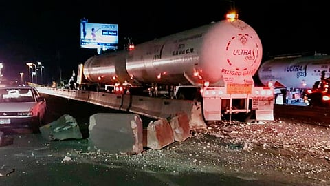 Se apreció que el tractocamión siniestrado es de la marca Kenworth, cabina azul, doble remolque con rótulos de Ultra Gas, y matrícula 994VT3, cuyo chofer fue detenido.