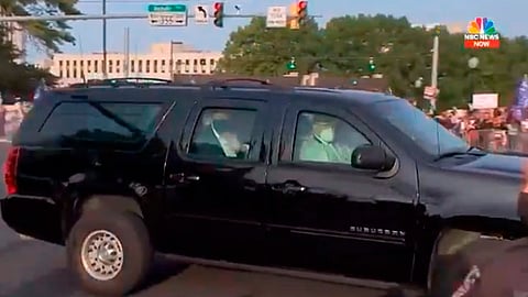 A bordo de una camioneta de la caravana presidencial, Trump saludó a la gente, portaba cubrebocas y no bajó los vidrios del vehículo.
