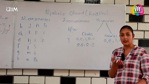 En el primer video la maestra enseña el alfabeto otomí, que a diferencia del idioma español, esta lengua indígena se divide en 22 consonantes, 14 vocales y 2 semiconsonantes.