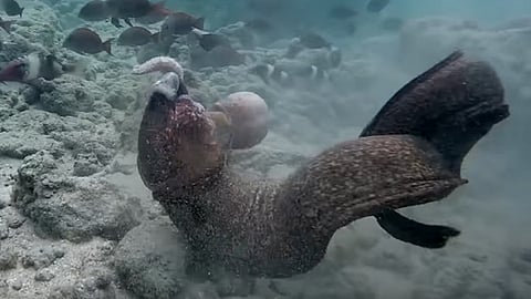 Uno de los buceadores no dudó en meterse debajo del agua para registrar el momento. En el video de YouTube podemos ver cómo el anguiliformese se las arregla para morder y arrancar uno de los tentáculos del pulpo.