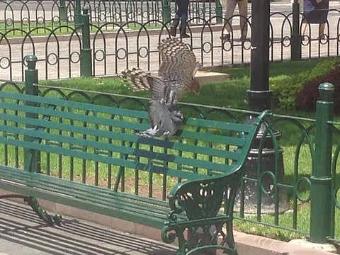 Morelia, Michoacán (MiMorelia.com/Redacción).- A través de redes sociales, se ha hecho viral un video en donde aparece un halcón en plena "caza" de palomas en la Plaza Jardín Morelos, lugar popularmente conocido como El Caballito en Morelia.